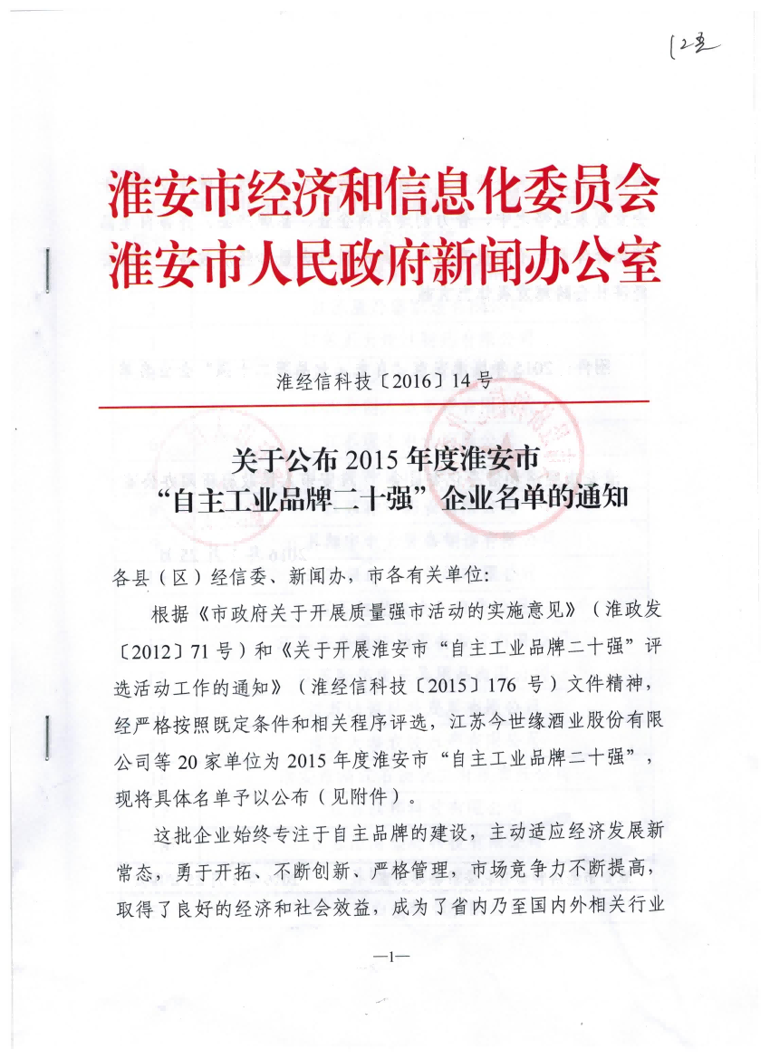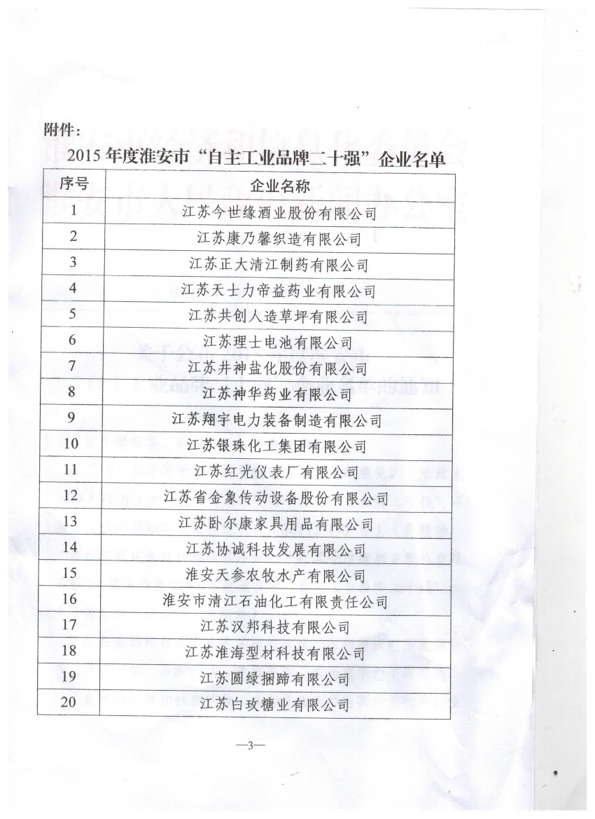 根據(jù)市政府評選,我公司被認(rèn)定為淮安市“自主品牌二十強(qiáng)”企業(yè)。“自主品牌二十強(qiáng)企業(yè)”是我市在國內(nèi)相關(guān)行業(yè)具有代表性并且競爭力較強(qiáng)的企業(yè),我公司名列第11名。
